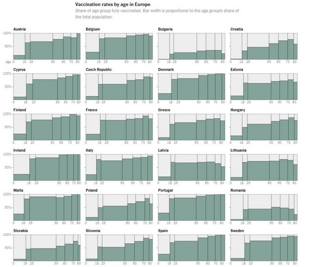 Σε Αυστρία, Γερμανία, Ιρλανδία και Ολλανδία (όπως και σε Πορτογαλία και Μάλτα φυσικά) που συγκαταλέγονται μεταξύ αυτών, οι μολύνσεις έχουν εκτοξευτεί, σε αντίθεση όμως με τον αριθμό των θανάτων που δεν παρουσιάζει αύξηση, γεγονός που επιβεβαιώνει και την αξία εμβολίου. Κάτι τέτοιο βέβαια δεν ισχύει σε χώρες με χαμηλά ποσοστά εμβολιασμού, όπως η Βουλγαρία, η Τσεχία, η Ουγγαρία και η Ρουμανία, όπου η αύξηση των θανάτων είναι ανάλογη με αυτή των θανάτων.