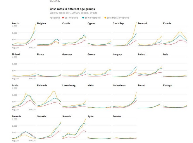 Εκτενές άρθρο των NYTimes για την επέλαση του κορονοϊού στη Γηραιά ήπειρο. Στο βαθύ κόκκινο η Ελλάδα. Οι μολύνσεις ανά ηλικιακή ομάδα και η πορεία των εμβολιασμών.