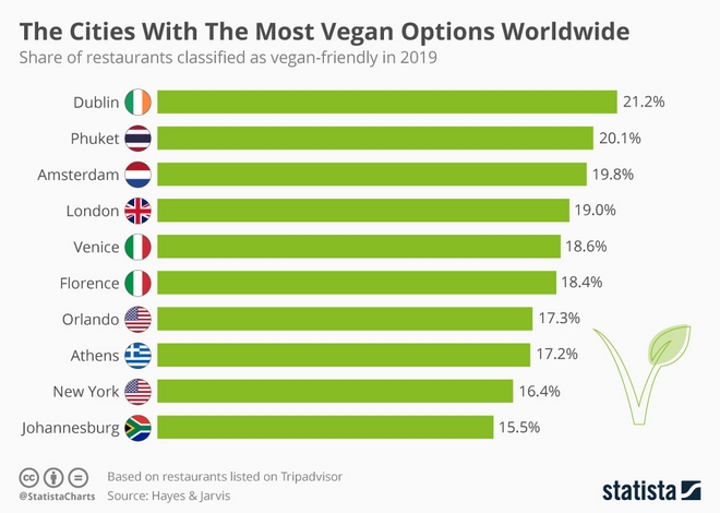 Στην κορυφή της λίστας βρέθηκε το Δουβλίνο με το 21.1% των εστιατορίων να χαρακτηρίζονται ως vegan ή έστω πως παρέχουν vegan επιλογές. Στην Δεύτερη θέση βρίσκεται το Πουκέτ με 20.1% και στην τρίτη θέση το Άμστερνταμ με 19.8%.