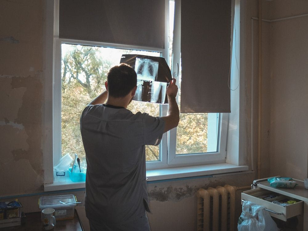 Ο φυσικοθεραπευτής των Γιατρών Χωρίς Σύνορα Oleksii Taranenko εξετάζει την ακτινογραφία ενός ασθενή πριν από τη συνεδρία.