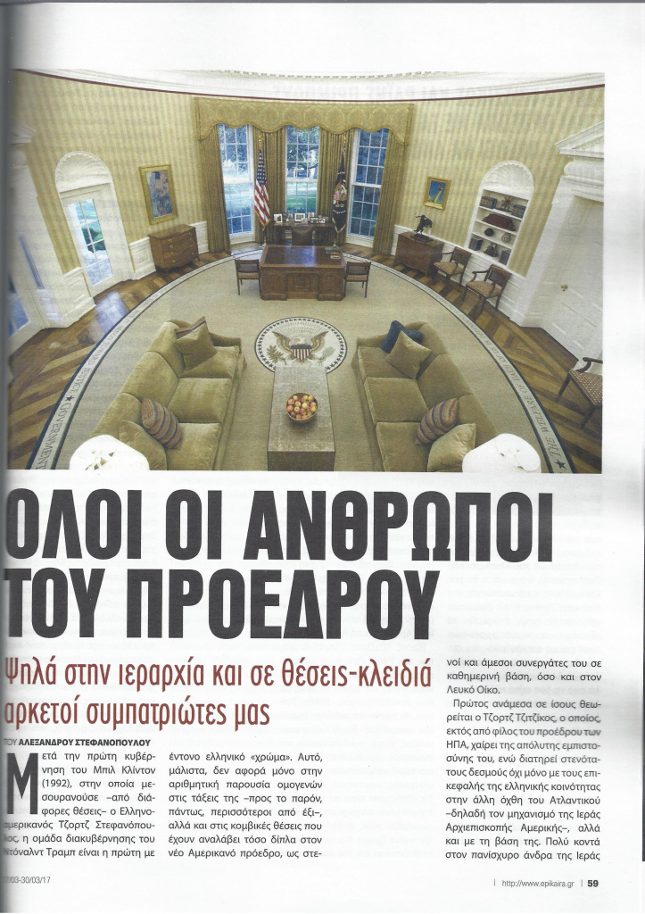 Μετά την πρώτη κυβέρνηση του Bill Clinton (1992) όπου το όνομα του George Stephanopoulos κυριαρχούσε για αρκετό καιρό –ανεξαρτήτως θέσεως δίπλα στον ισχυρό άνδρα του Λευκού Οίκου- ως τον «άνθρωπο κλειδί» του (τότε) Αμερικανού Προέδρου η ομάδα διακυβέρνησης του Ντόναλντ Τραμπ έχει έντονο-εντονότατο- ελληνικό χρώμα. Όχι τόσο για την αριθμητική παρουσία τους-περισσότεροι από 6 στο σύνολο τους προς το παρόν- όσο για τις θέσεις κλειδιά που έχουν αναλάβει τόσο δίπλα στον νέο Αμερικανό Πρόεδρο, ως στενοί και άμεσοι συνεργάτες του σε καθημερινή βάση, όσο και στον ίδιο τον Λευκό Οίκο, ως θεσμό της ανώτατης έκφρασης της Αμερικανικής Ομοσπονδιακής διακυβέρνησης των ΗΠΑ.