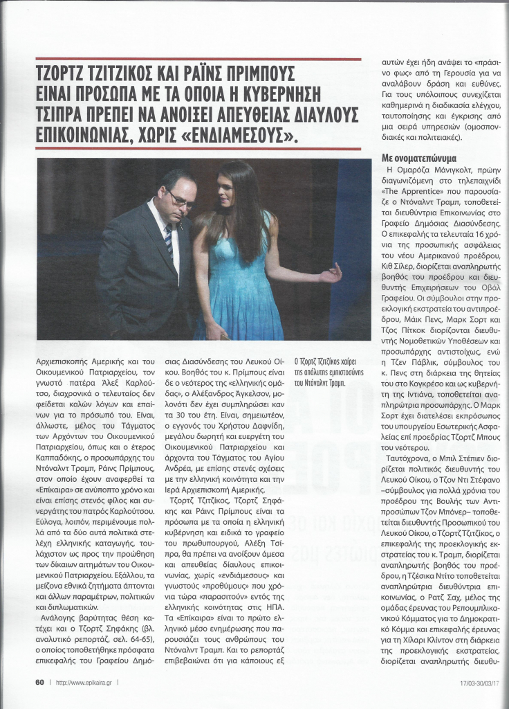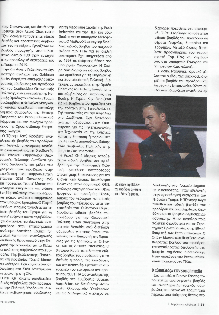 Τα ίδια ισχύουν και για τον Reince Priiebus, για τον οποίο επίσης τα επίκαιρα σε ανύποπτο χρόνο από τις αρχές Φεβ. του 2016 έχουν αναφερθεί και εν συνεχεία έχουν γραφεί πολλά και στην Ελλάδα-αρκετά εξ αυτών υπερβολικά και ανεδαφικά – και στον Αμερικανικό Τύπο οπότε θα ήταν πλεονασμός να προστεθεί κάτι περαιτέρω. Ωστόσο δεν μπορεί να παραβλεφθεί το γεγονός ότι και o δεύτερος εκ των ισχυρών του Λευκού Οίκου είναι επίσης μέλος του τάγματος των Αρχόντων του Οικουμενικού Πατριαρχείου και στενός φίλος και συνεργάτης με τον Father Alex Karloutso. Οπότε δικαίως και εύλογα να αναμένονται πολλά περισσότερα από τα δυο αυτά πολιτικά στελέχη ελληνικής καταγωγής τουλάχιστον ως προς την προώθηση των δίκαιων αιτημάτων του Οικουμενικού Πατριαρχείου, και όχι τόσο για τα μείζονας εθνικής σημασίας Ελληνικά ζητήματα τα οποία άπτονται και άλλων πολιτικών και διπλωματικών παραμέτρων.