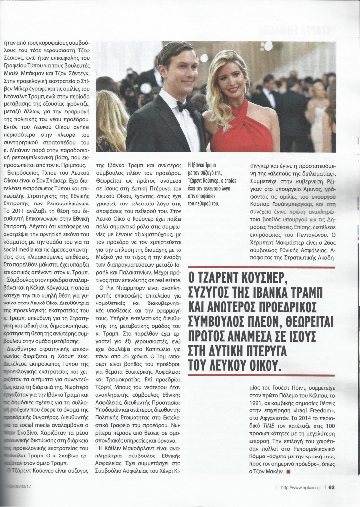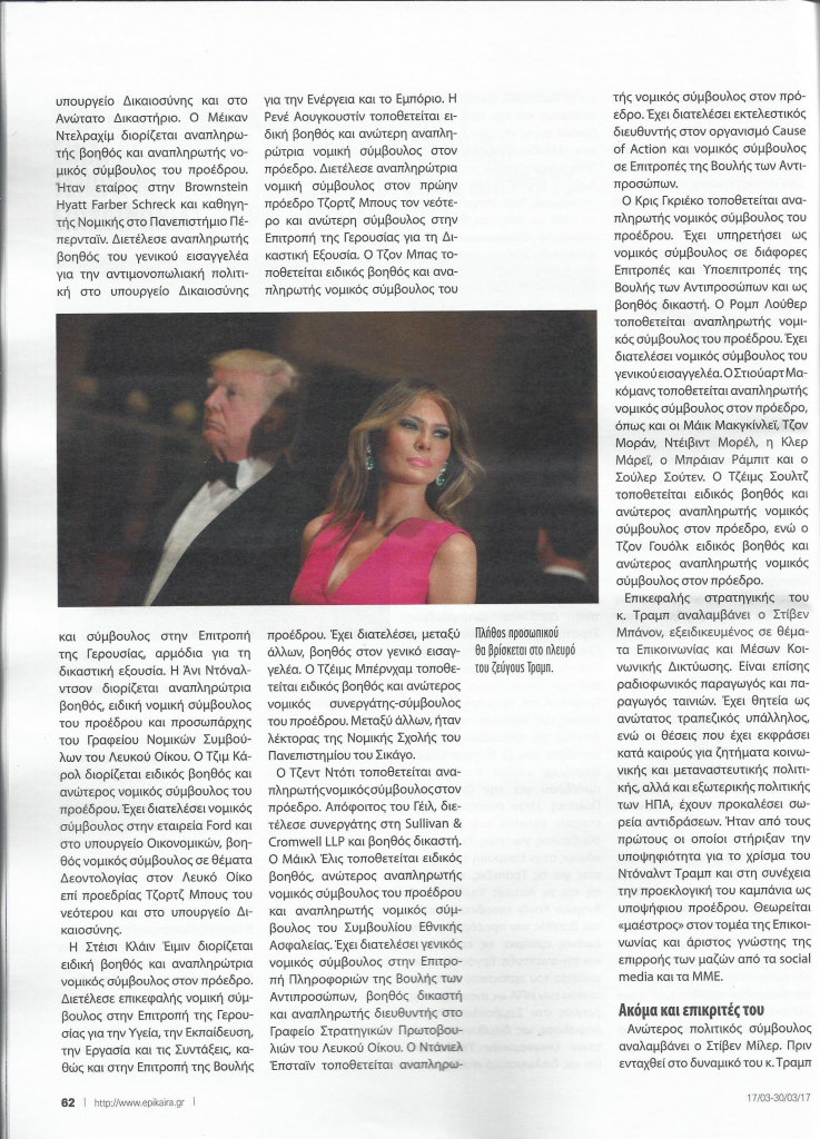 Μετά από αρκετή και συστηματική έρευνα και εξονυχιστική διασταύρωση –καθώς τα ονόματα διαρκώς άλλαζαν για ημέρες και αναλόγως διασυνδέσεων του κάθε ενός από τα υποψήφια μέλη να εργαστούν για τον πρόεδρο και το γραφείο του στο Λευκό Οίκο, με τοπικά ή συστημικά ΜΜΕ- τα Επίκαιρα παρουσιάζουν για πρω΄τη φορά στην Ελλάδα αι σε πρώτη αποκλειστική δημοσίευση, τα κυριότερα ονόματα αναλόγως θέσης και αξιώματος δίπλα στον Αμερικανό Πρόεδρο Ντ. Τράμπ. Ολόκληρη και η πλήρης λίστα δημοσιεύεται και είναι διαθέσημη (online) από τις 18 Μαρτίου στην διαδικτυακή έκδοση της ιστορικής εφημερίδας «Η ΠΡΩΙΝΗ» {http://neaproini.us/ } με σνεχή ενημέρωση (UPD) και ειδικές εξειδικευμένες αναλύσεις για τα επιτελείο του Αμερικανού Προέδρου στο www.GreekAmericanNewsAgency.com.