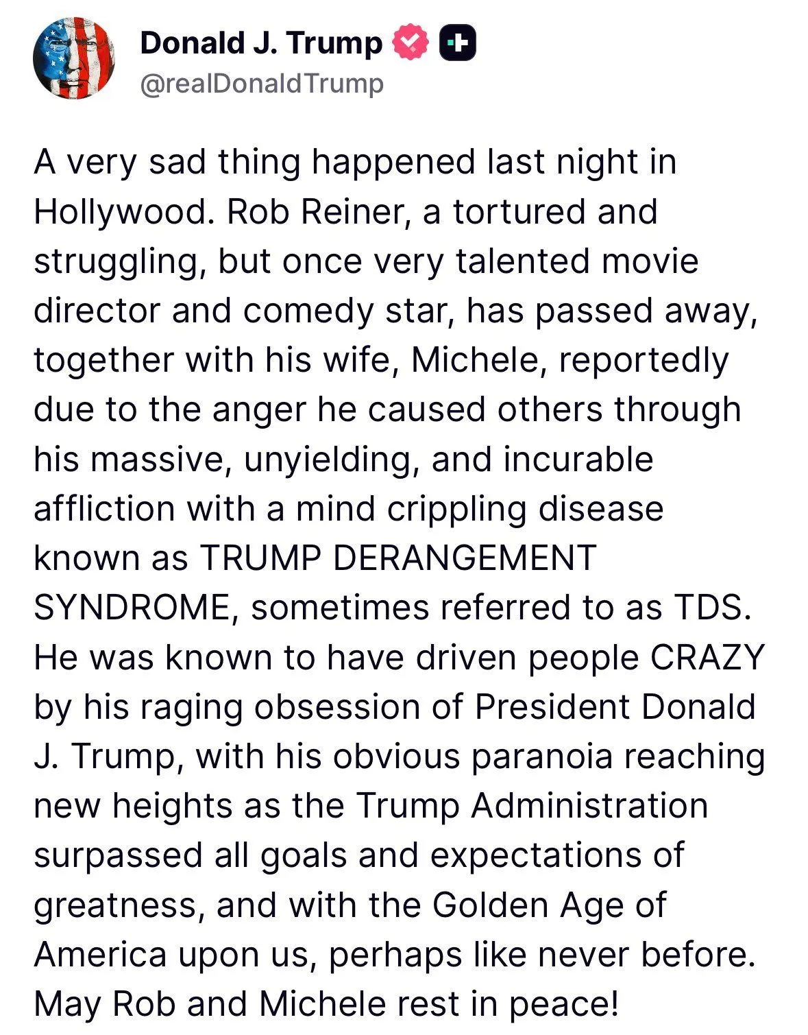 «Ένα πολύ θλιβερό γεγονός συνέβη χθες βράδυ (σ.σ. την Κυριακή) στο Χόλιγουντ. Ο Ρομπ Ράινερ, ένας βασανισμένος και προβληματικός, αλλά κάποτε πολύ ταλαντούχος σκηνοθέτης και κωμικός ηθοποιός, απεβίωσε μαζί με τη σύζυγό του Μισέλ, σύμφωνα με πληροφορίες εξαιτίας της οργής που προκάλεσε στους άλλους μέσω της τεράστιας, αδιάλλακτης και ανίατης προσβολής του από μια νοητικά παραλυτική ασθένεια, γνωστή ως Σύνδρομο Διαταραχής από τον Τραμπ (Trump Derangement Syndrome – TDS).