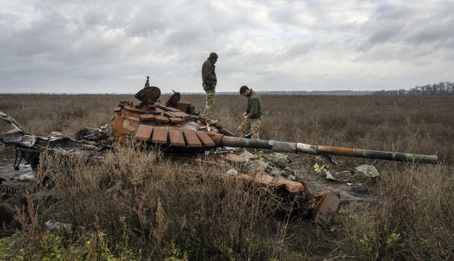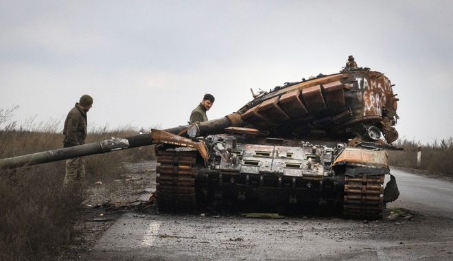 Ουκρανοί στρατιώτες δίπλα από κατεστραμμένα ρωσικά τανκς AP Photo/Efrem Lukatsky