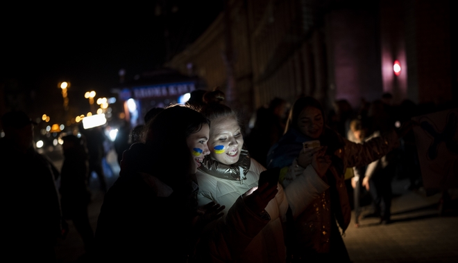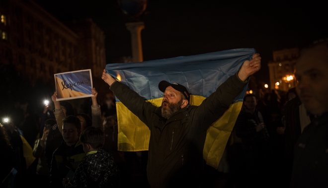 Ουκρανοί πολίτες πανηγυρίζουν στο Κίεβο την αποχώρηση των ρωσικών σρατευμάτων από τη Χερσώνα AP Photo/Bernat Armangue