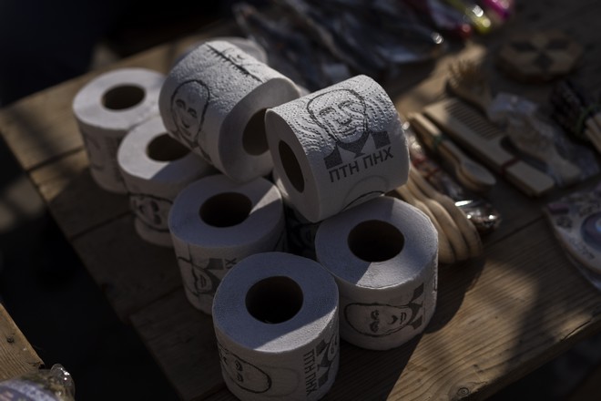Τρανό παράδειγμα τα παρακάτω χαρτιά υγείας με φωτογραφίες του Πούτιν που πωλούνται σε μια υπαίθρια αγορά στο Λβιβ της δυτικής Ουκρανίας, μία από τις πόλεις που έχουν χτυπηθεί πολλάκις κατά την ρωσική εισβολή.