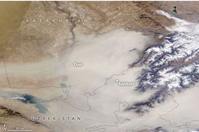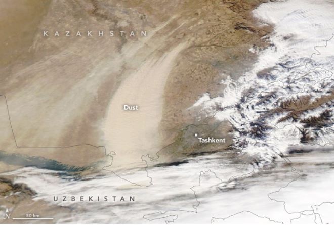 Το Φασματοραδιόμετρο Απεικόνισης Μέτριας Ευκρίνειας (MODIS) στον δορυφόρο Terra της NASA κατέγραψε την εικόνα όπου παχιά «λοφία» σκόνης πλησιάζουν την Τασκένδη στις 4 Νοεμβρίου 2021. Κάποια ποσότητα από τη σκόνη φάνηκε να προέρχεται από ξεραμένες γεωργικές εκτάσεις, βοσκοτόπια και λιβάδια στα βορειοανατολικά την περιοχή Τουρκεστάν του Καζακστάν.