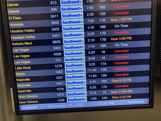 Τη Δευτέρα (26/12), μία ημέρα μετά τα Χριστούγεννα, η Southwest ακύρωσε 2.900 πτήσεις, που αντιστοιχούν στο 70% του συνολικού της προγράμματος, εγκλωβίζοντας εξαγριωμένους επιβάτες στα αεροδρόμια.