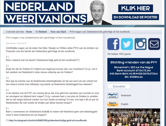 Ο αρχηγός του “Κόμματος για την ελευθερία” μαζί με άλλους δύο βουλευτές του ρωτούν αρχικά να μάθουν ποιο είναι το ύψος της δόσης που θα λάβει η Ελλάδα και σε ποιο ποσοστό μετέχει σε αυτό η Ολλανδία.