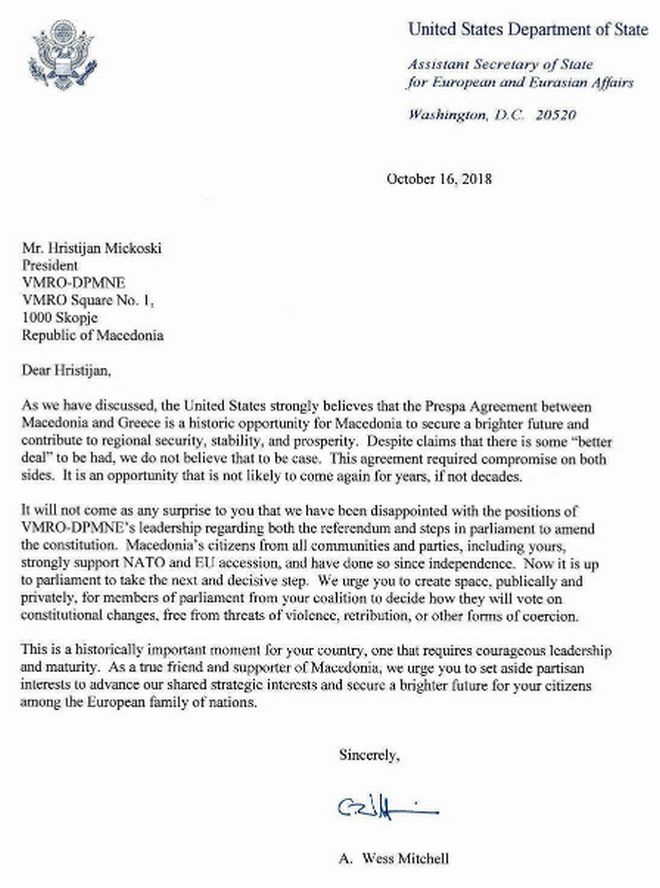 Το Στέιτ Ντιπάρτμεντ καλεί την ηγεσία του VMRO να επιτρέψει στους βουλευτές να ψηφίσουν κατά συνείδηση για το Σύνταγμα, "δίχως απειλές για βία, εκδίκηση ή άλλες μορφές πίεσης" - Όλη η επιστολή του Γουές Μίτσελ στον επικεφαλής του VMRO.