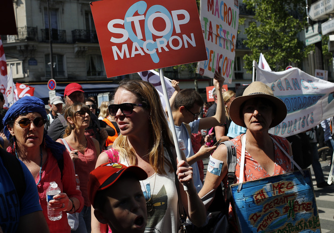 Η διαδήλωση που ονομάστηκε ένα “Πάρτυ για τον Μακρόν” ( “la Fête à Macron”) ξεκίνησε νωρίτερα σήμερα από την Place de l’Opera μέσα σε εορταστική ατμόσφαιρα με καλοκαιρία και μαζικό πικνίκ αλλά και με τους συμμετέχοντες να κρατούν πανό που έγραφαν “Σταματήστε τον Μακρόν”, “Μακρόν, ο πρόεδρος των πλουσίων” και “Μακρόν, βγες από το τοπίο”.