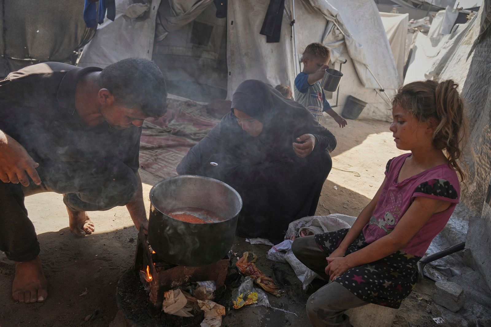 Fadi and Abeer Sobh cook lentil soup in their tent at a camp for displaced Palestinians in Gaza City, Thursday, July 24, 2025. (AP Photo/Jehad Alshrafi)