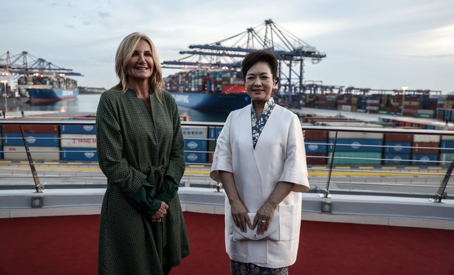 Η Πένγκ Λιγουάν για την επίσκεψή της στις εγκαταστάσεις της Cosco επέλεξε αποχρώσεις του λευκού και φλοράλ φόρεμα.