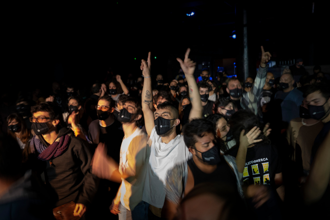 Αγκαλιάστηκαν, χόρεψαν, τραγούδησαν…Λάτρεις της ροκ μουσικής παρεβρέθηκαν σε μια sold-out συναυλία το Σάββατο το βράδυ στη Βαρκελώνη, αφού είχαν κάνει rapid tests για την Covid-19. Οι περίπου 5.000 θεατές στη συναυλία του ισπανικού συγκροτήματος Love of Lesbian ήταν υποχρεωμένοι να φορούν μάσκες, αλλά όχι να κρατούν κοινωνικές αποστάσεις στο γήπεδο Παλάου Σαν Ζόρντι.