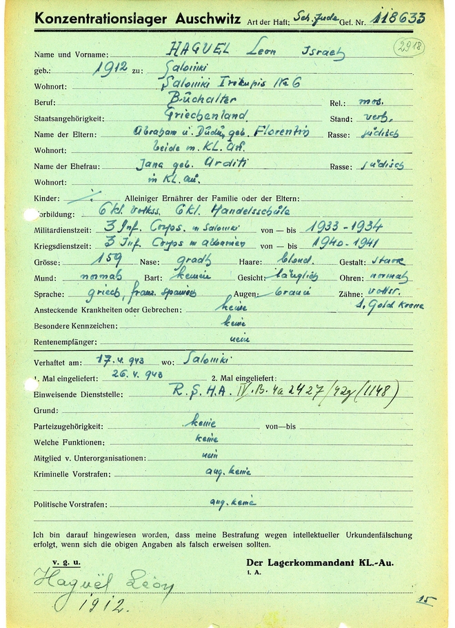Γυρίζοντας λίγο πίσω, ο Λεών, η Ζάν, η έγκυος θεία μου Ματίλντα, ο μικρός εξάδελφός μου Ιακώβ, ο πατέρας του Μωΰς, ο παππούς και η γιαγιά μου φορτώθηκαν μαζί με άλλες 2800 ψυχές σε ένα συρμό την 19 Απριλίου 1943. Ο συρμός έφτασε στο Άουσσβιτς την 26 Απριλίου. Όλοι, εκτός του Λεών, σε λίγες ώρες δεν υπήρχαν. Αλλά και ο Λεών έπαψε να υπάρχει. Έγινε ο αριθμός 118633.