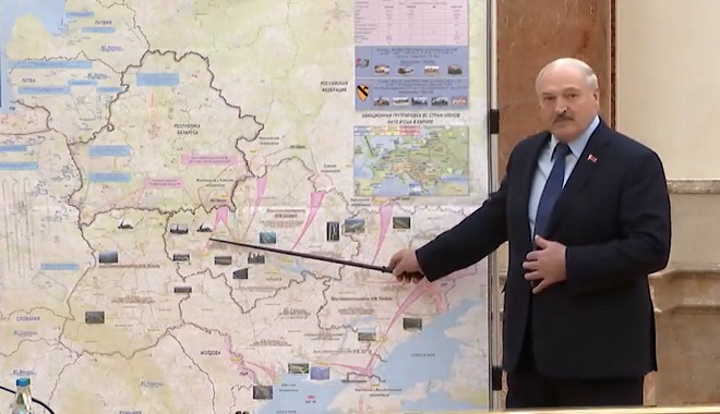 Όπως βλέπετε, ο Λουκασένκο υποδεικνύει το σχέδιο στρατιωτικής ανάπτυξης των Ρώσων στην Ουκρανία, με το κάτω μέρος του χάρτη να υποδεικνύει κίνηση στρατευμάτων και στη Μολδαβία.