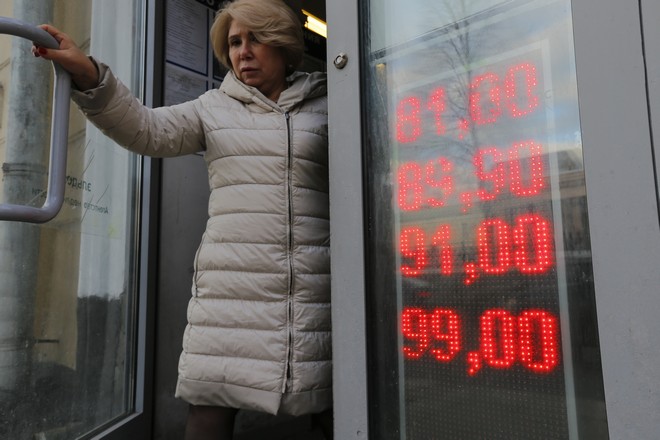 Γυναίκα βγαίνει από ανταλλακτήριο συναλλάγματος στη Μόσχα 2022 Alexander Zemlianichenko Jr., File/AP Photo