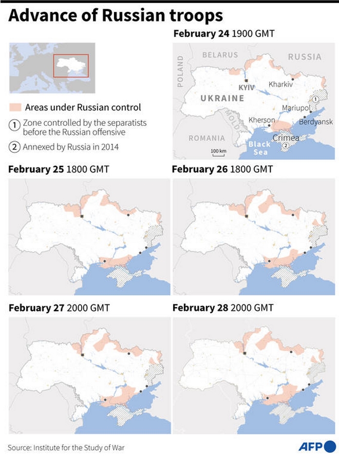 Στους χάρτες που έδωσε στη δημοσιότητα Institute for the Study of War (ISW), απεικονίζονται οι περιοχές της Ουκρανίας που βρίσκονται πλέον υπό ρωσικό έλεγχο καθώς και η προέλαση των ρωσικών στρατευμάτων από την Πέμπτη 24 Φεβρουαρίου, οπότε και πραγματοποιήθηκε η ρωσική εισβολή έως και τη Δευτέρα28 Φεβρουαρίου.