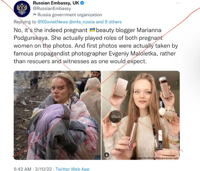 Η έγκυος γυναίκα είχε βρεθεί στο στόχαστρο πολλών χρηστών του διαδικτύου, με τη ρωσική πρεσβεία στη Μεγάλη Βρετανία να μεταδίδει ότι δεν ήταν έγκυος και δεν βρισκόταν στο συγκεκριμένο κτήριο αλλά ήταν ηθοποιός η οποία μάλιστα έβαλε μέικ απ για να δείξει πως έχει αίματα από την επίθεση.