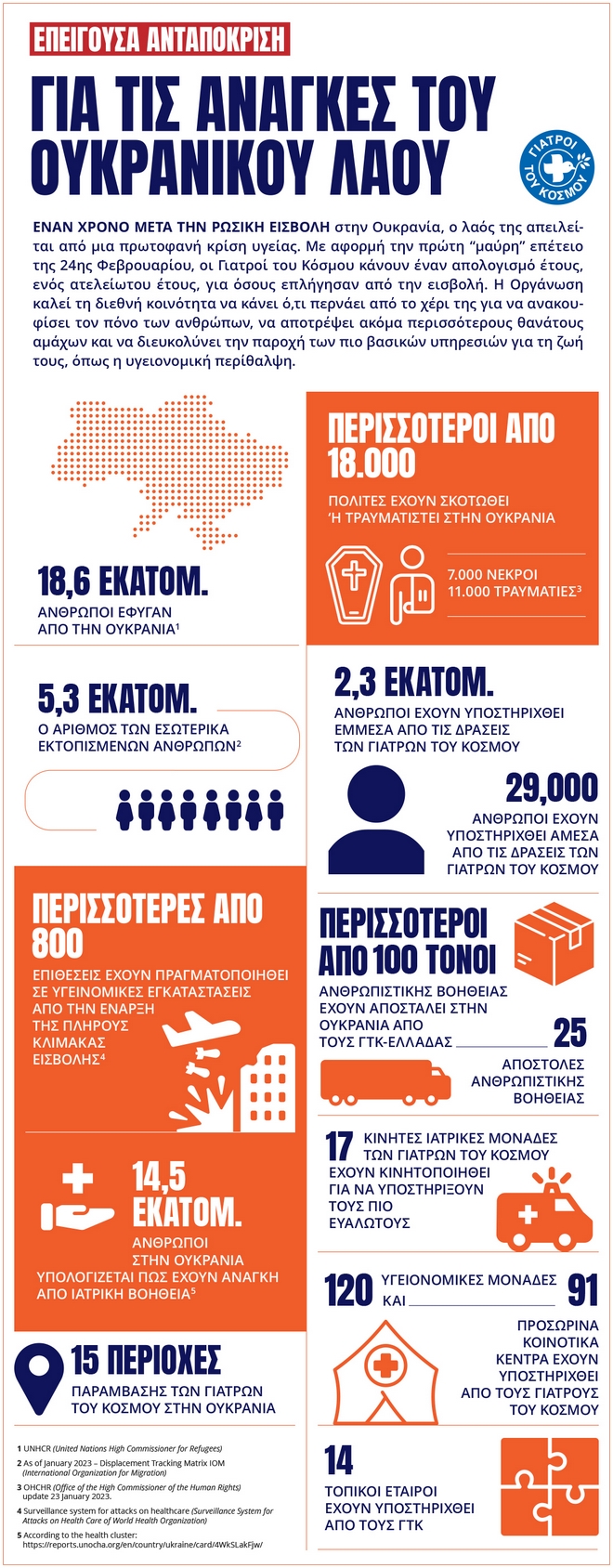 Μετά από ένα χρόνο εντατικής συνεργασίας με το σύστημα υγείας της Ουκρανίας, οι ΓτΚ προειδοποιούν ότι το σύστημα υγείας βρίσκεται σε σοβαρό κίνδυνο μετά από πολυάριθμες επιθέσεις στις υποδομές υγείας και λόγω της έλλειψης φαρμάκων και υγειονομικών προμηθειών, καθώς και λόγω των περιορισμών στις μετακινήσεις του πληθυσμού που τον εμποδίζουν να λάβει ιατρική περίθαλψη.