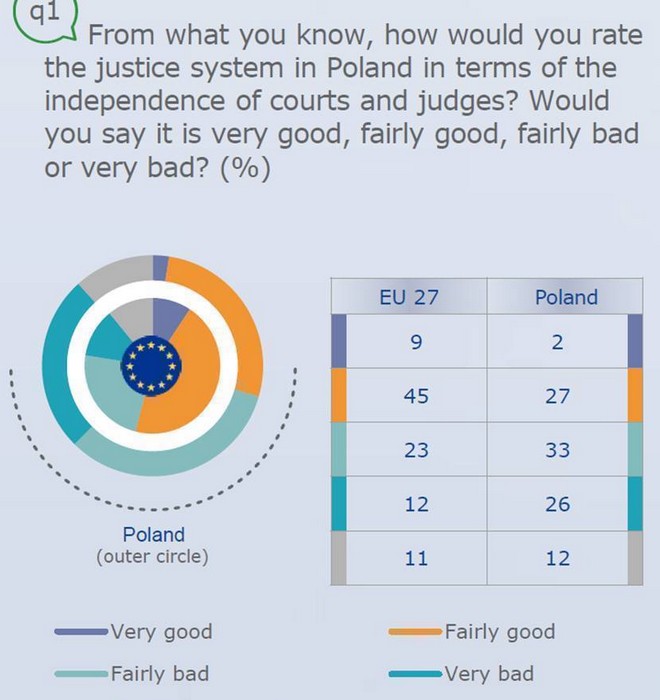 Αξιοσημείωτο επίσης είναι το 59% που αντιστοιχεί στις απαντήσεις “σχετικά κακό και πολύ κακό” αναφορικά με το νομικό σύστημα της Πολωνίας,