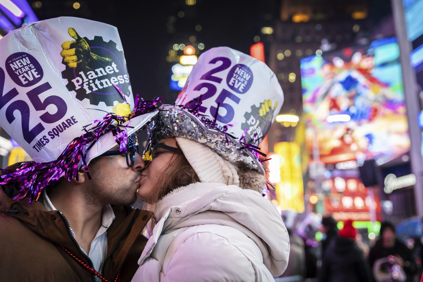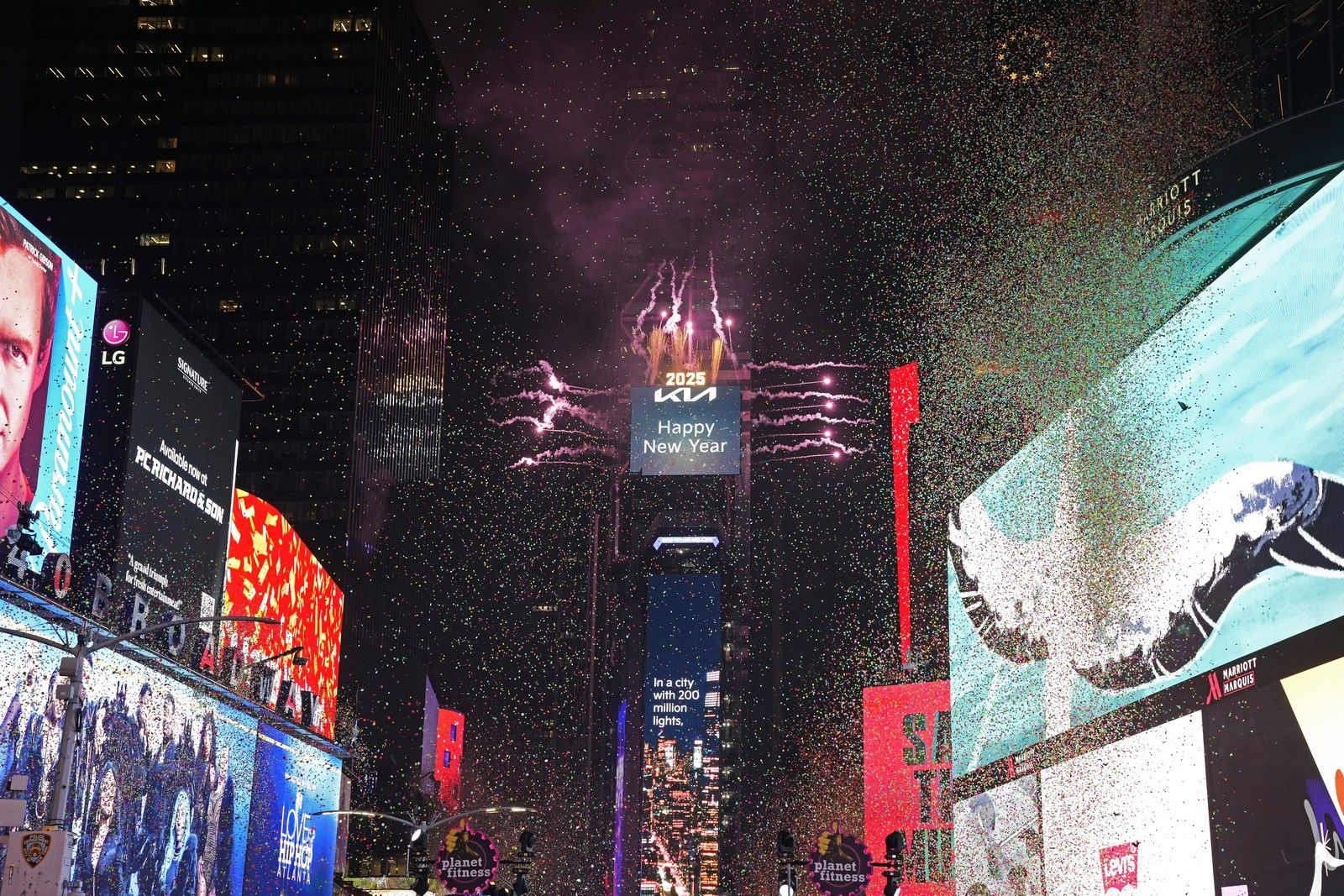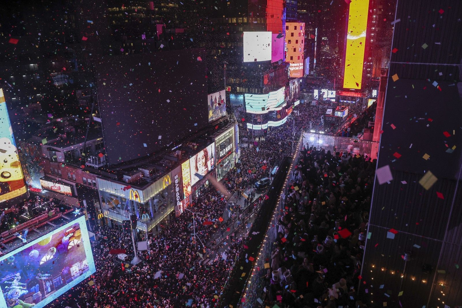 Στη Νέα Υόρκη, δεκάδες χιλιάδες άνθρωποι συγκεντρώθηκαν στην εμβληματική Times Square περιμένοντας την κάθοδο της διάσημης φωτισμένης σφαίρας των πέντε τόνων που σηματοδοτεί το πέρασμα στη νέα χρονιά.