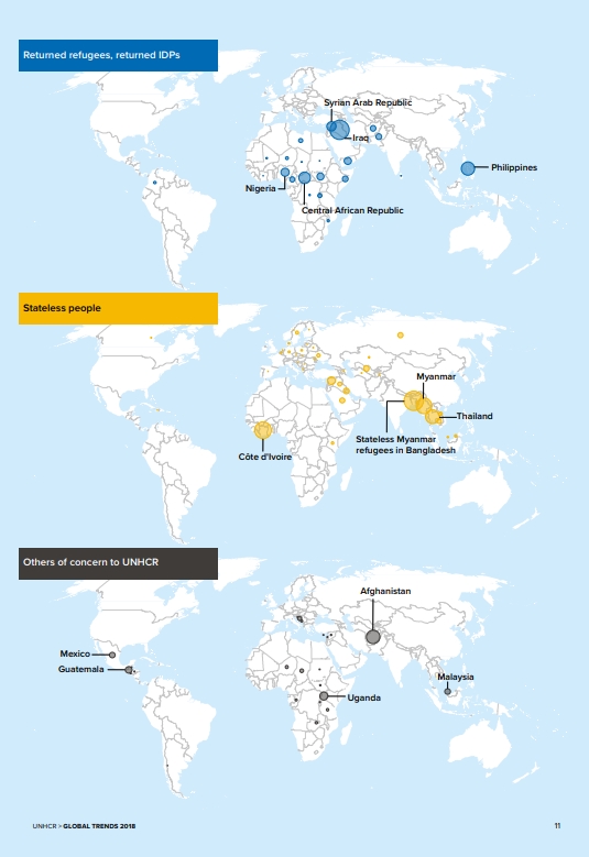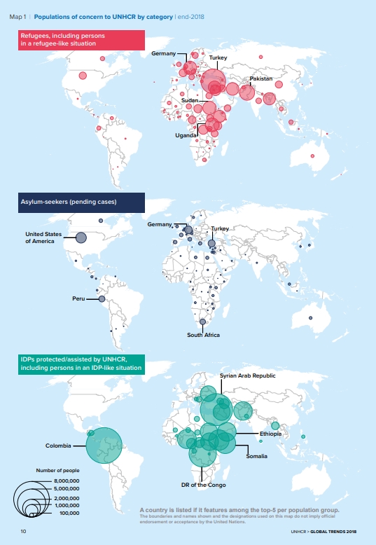 Σύμφωνα με τον γενικό γραμματέα του ΟΗΕ, οι περισσότεροι από τους βίαια εκτοπισμένους προέρχονται από λίγες μόνο χώρες: Συρία, Αφγανιστάν, Νότιο Σουδάν, Μυανμάρ και Σομαλία. Τους τελευταίους 18 μήνες, εκατομμύρια άλλοι έχουν τραπεί σε φυγή από τη Βενεζουέλα.