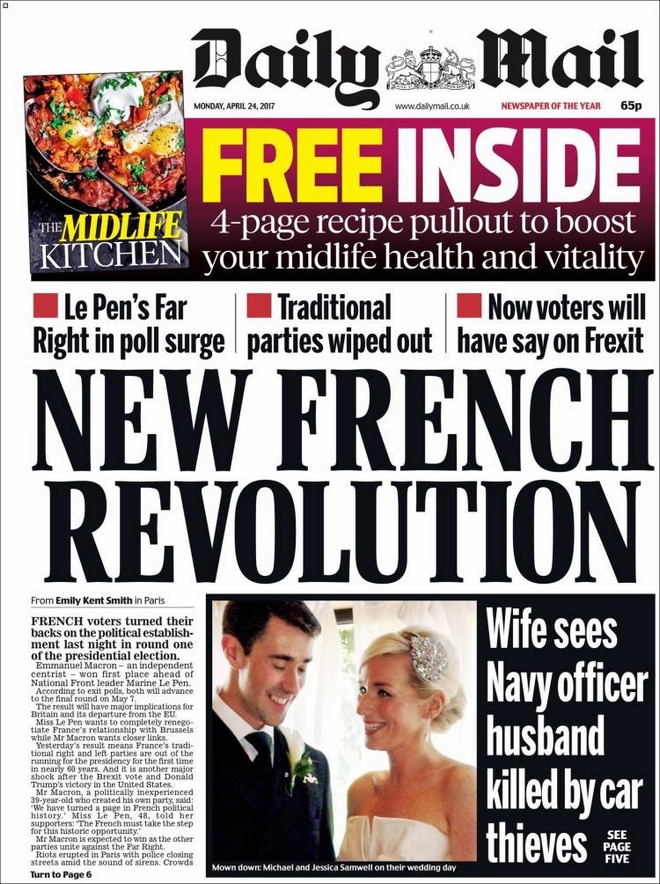 Από την πλευρά της η συντηρητική Daily Mail έχει τίτλο «Η νέα γαλλική επανάσταση», εξηγώντας ότι η Γαλλία αντιμετωπίζει τώρα το δικό της δημοψήφισμα για την παραμονή της στην Ευρωζώνη, ενώ οι Times κάνουν λόγο για «την ταπείνωση της γαλλικής ελίτ από τους περιθωριακούς (που βρίσκονται) στον δρόμο προς τη νίκη» με μια φωτογραφία της Μαρίν Λεπέν χαμογελαστή.