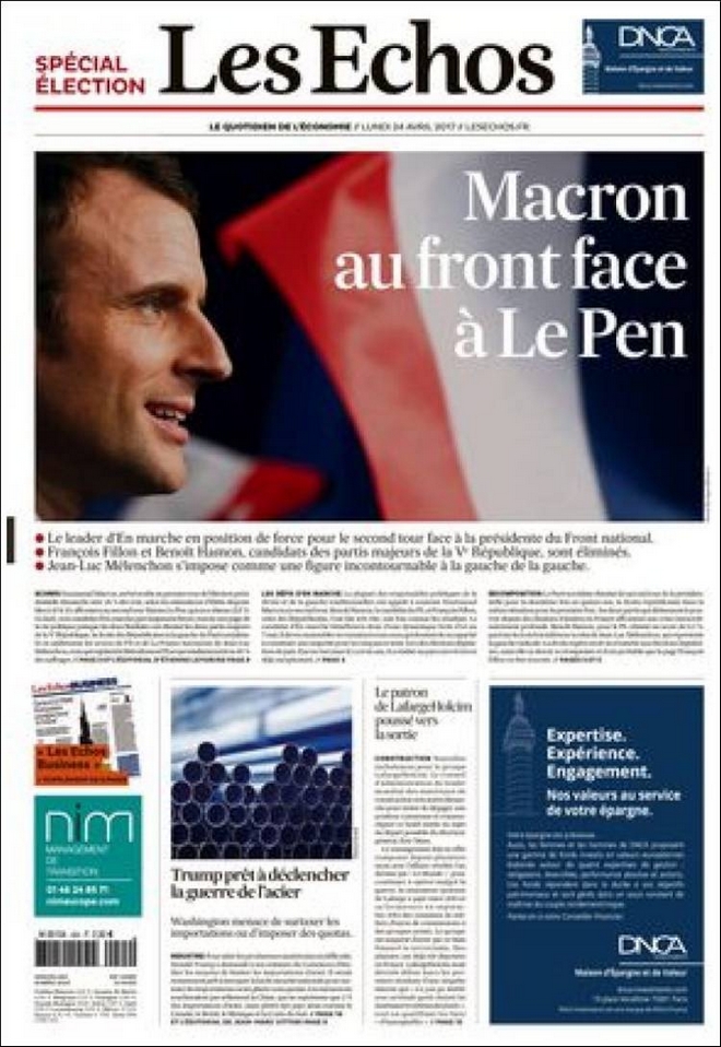 Η « Les Echos» με τον κεντρώο υποψήφιο και εκείνη στο πρωτοσέλιδό της γράφει: «Ο Μακρόν μπροστά από τη Λεπέν.