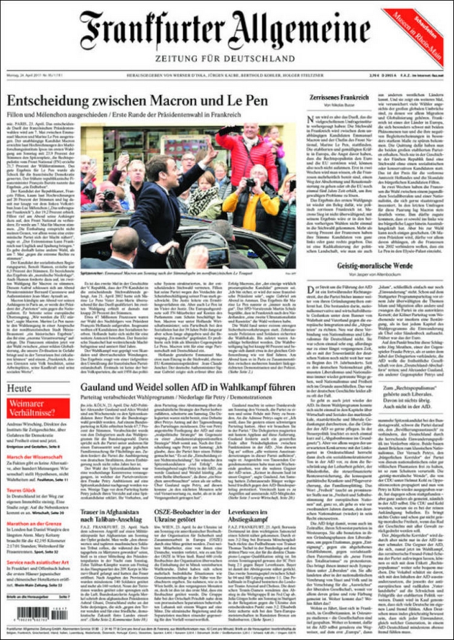 Η εφημερίδα Frankfurter Allgemeine Zeitung εμφανίζεται επιφυλακτική και έχει στην πρώτη της σελίδα τον τίτλο: «Η Γαλλία διχασμένη»: «Περισσότερο από το 40% των Γάλλων ψήφισε για υποψήφιους της άκρας δεξιάς ή της άκρας αριστεράς. Η νίκη του Μακρόν είναι οριακή ενώ στις προηγούμενες προεδρικές εκλογές (του 2007 και του 2012) δεν θα είχε περάσει στον δεύτερο γύρο».