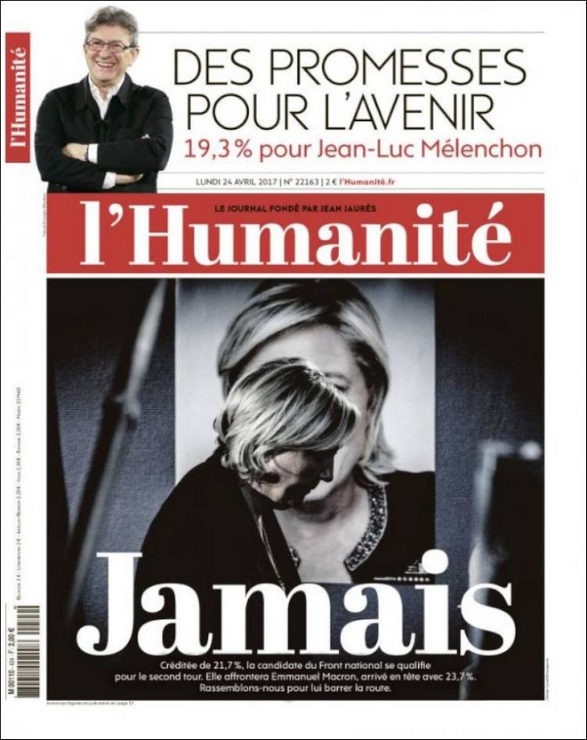 Η παραδοσιακή εφημερίδα της Αριστεράς « L’Humanité» στηρίζει τον κεντρώο ανεξάρτητο υποψήφιο, στέλνοντας σαφές μήνυμα ενάντια στην ακροδεξιά Λεπέν. Μία φωτογραφία της επικεφαλής του «Εθνικού Μετώπου», με σκυμμένο το κεφάλι, και μία λέξη-τίλος: «Ποτέ».