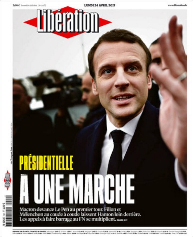 Η Liberation επέλεξε για το πρωτοσέλιδό της μία φωτογραφία του Μακρόν από τους πανηγυρισμούς μετά την επικράτησή του στον πρώτο γύρο, με τίτλο: «Προεδρία, σε μία βόλτα».