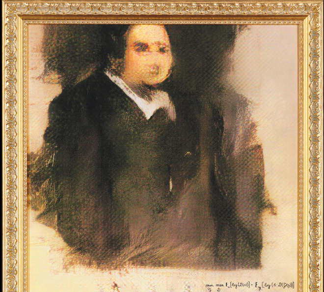 Ο πίνακας με τίτλο “Πορτρέτο του Έντμοντ Μπέλαμι” (πρόκειται για φανταστικό πρόσωπο) έχει δημιουργηθεί από την καλλιτεχνική κολεκτίβα Obvious με έδρα το Παρίσι, με τη χρήση ενός αλγόριθμου GAN (Generative Adversarial Network), ο οποίος είχε τροφοδοτηθεί προηγουμένως με 15.000 πορτρέτα ζωγραφισμένα μεταξύ του 14ου και του 20ού αιώνα. Ο ίδιος αλγόριθμος έχει δημιουργήσει και άλλα έργα τέχνης, όπως γυμνά και τοπία.