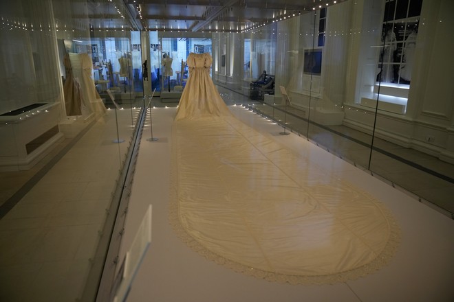 Το φόρεμα διαθέτει μία μεγάλη ουρά 8 μέτρων και θεωρείται “ένα από τα πιο διάσημα στην ιστορία των γάμων”, όπως δήλωσαν οι διοργανωτές της έκθεσης.