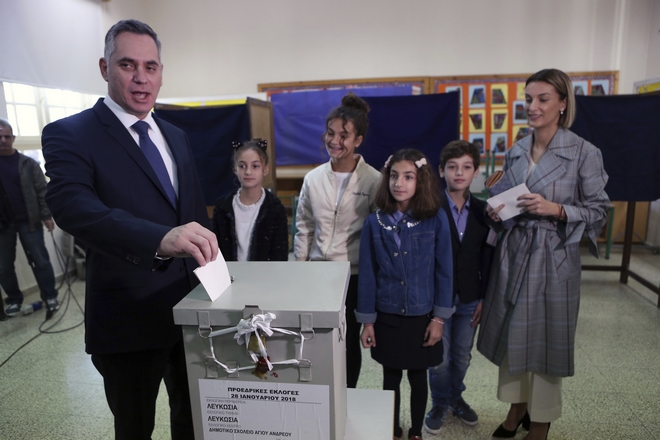 Cypriot Presidential candidate and leader of the center-right DIKO party Nicolas Papadopoulos escorted by his family votes in presidential elections in capital Nicosia, on Sunday, Jan. 28, 2018. Cypriots are voting for a new president they hope will overcome years of failure to resolve the island-nation's ethnic division and deliver more benefits from an economy on the rebound after a severe financial crisis. (AP Photo/Petros Karadjias) AP