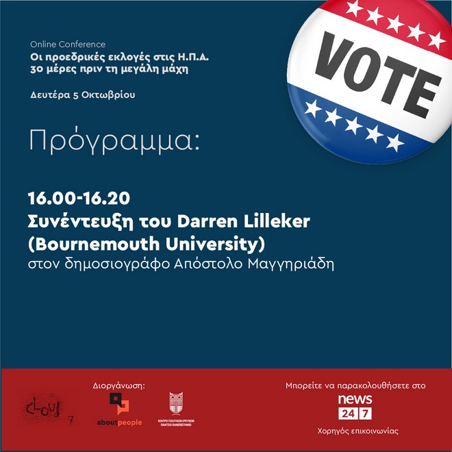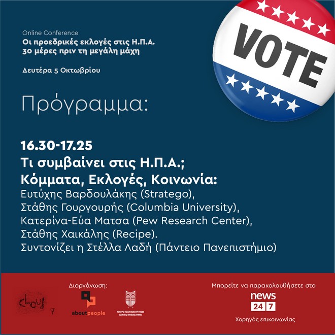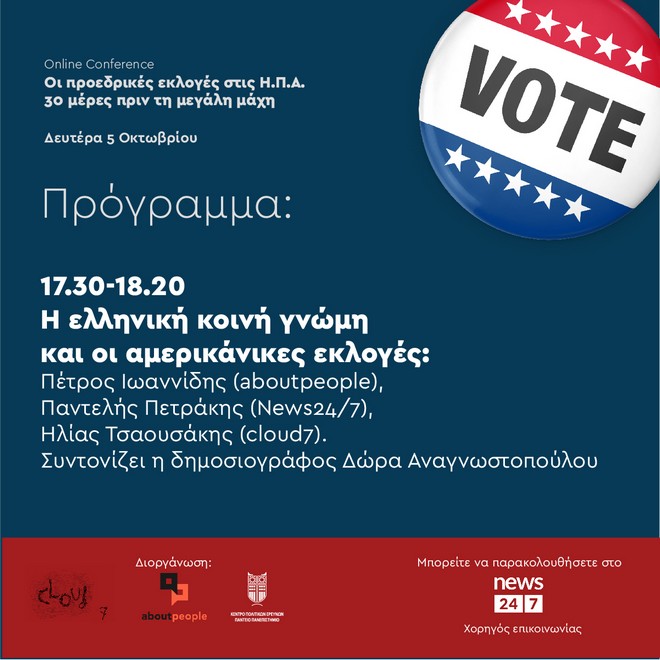 Παρακολουθείστε την Online Conference των aboutpeople και cloud7, σε συνεργασία με το Κέντρο Πολιτικών Ερευνών του Παντειου Πανεπιστημίου, για τις προεδρικές εκλογές στις ΗΠΑ, απευθείας από το News 24/7
