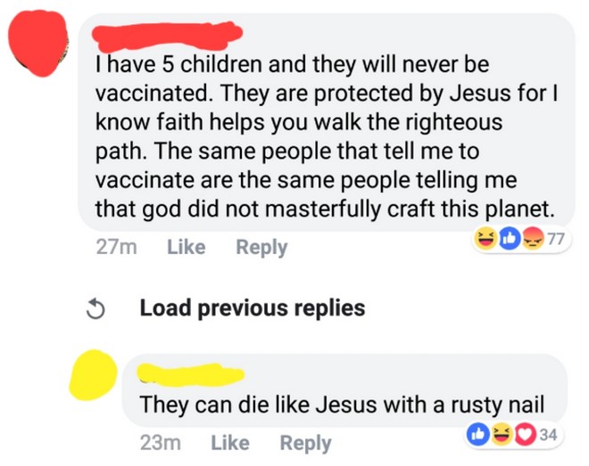 “Έχω πέντε παιδιά και δεν θα εμβολιαστούν ποτέ. Είναι προστατευμένα από τον Ιησού γιατί γνωρίζω ότι η πίστη βοηθά να περπατήσεις στο ενάρετο μονοπάτι. Οι ίδιοι άνθρωποι που μου λένε να κάνω τους εμβολιασμούς, υποστηρίζουν ότι ο Θεός δεν δημιούργησε με μαεστρία τον κόσμο” τονίζει η μητέρα σε ανάρτησή της στο facebook.