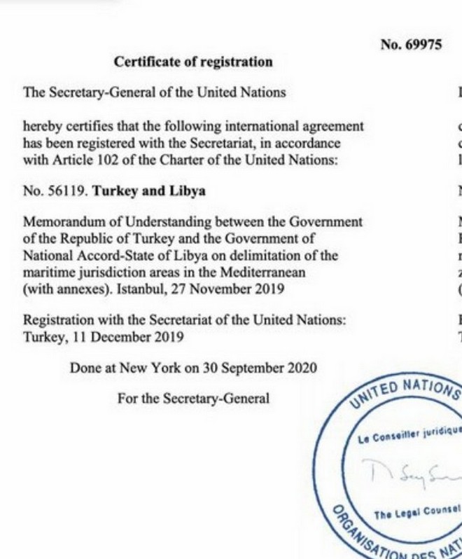 Διπλωματικές πηγές αναφέρουν ότι μετά από 10 μήνες από την κατάθεσή του, πρωτοκολλήθηκε το παράνομο μνημόνιο οριοθέτησης θαλασσίων ζωνών μεταξύ της Τουρκίας και της Κυβέρνησης της Τρίπολης, στον ΟΗΕ.