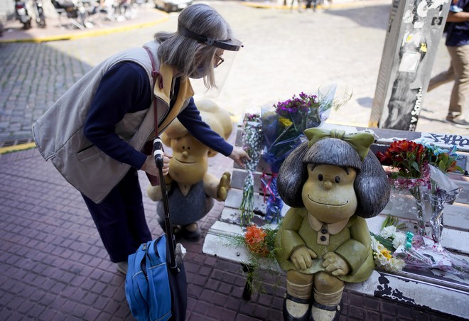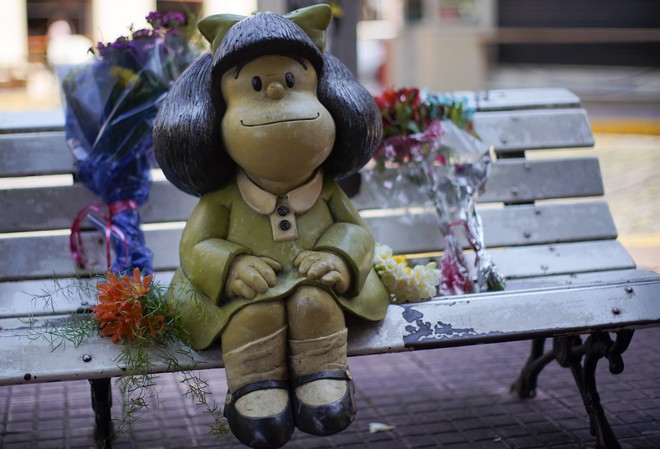 Το άγαλμα της Μαφάλντας, του κοριτσιού που μισεί τη σούπα και λατρεύει τους Beatles, κατακλύστηκε από λουλούδια, από αναγνώστες που πήγαν να τιμήσουν τον δημιουργό της στην ιστορική συνοικία Σαν Τέλμο, στο κέντρο του Μπουένος Άιρες.
