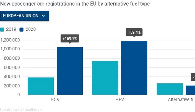 Συνολικά το 2020, τα υβριδικά οχήματα (αυτοφορτιζόμενα με μπαταρία / γεννήτρια, HEV) αποτελούσαν το 11,9% των συνολικών πωλήσεων επιβατικών αυτοκινήτων σε ολόκληρη την ΕΕ, από 5,7% το 2019. Επίσης, τα ηλεκτρικά και Plug-in υβριδικά (ECV) οχήματα, σημείωσαν παρόμοια αύξηση της ζήτησης πέρυσι, αντιπροσωπεύοντας το 10,5% όλων των νέων ταξινομήσεων αυτοκινήτων στην Ευρωπαϊκή Ένωση, σε σύγκριση με ένα μερίδιο αγοράς 3,0% το προηγούμενο έτος!