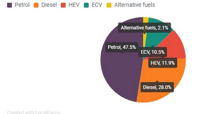 Πάντως, αυτό το ποσοστό βαίνει μειούμενο, καθώς από τον Οκτώβριο έως τον Δεκέμβριο του 2020, οι πωλήσεις ντίζελ και βενζινοκίνητων αυτοκινήτων σημείωσαν σημαντικές απώλειες.