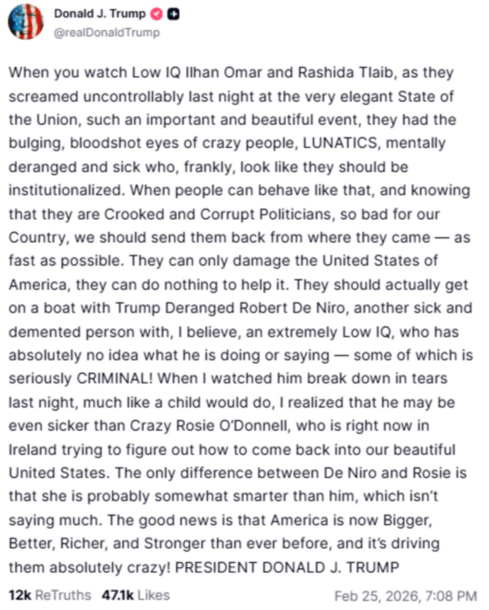 «Το καλό νέο είναι ότι η Αμερική είναι τώρα Μεγαλύτερη, Καλύτερη, Πλουσιότερη και Ισχυρότερη από ποτέ και αυτό τους τρελαίνει απολύτως!» κατέληξε στην ανάρτησή του.