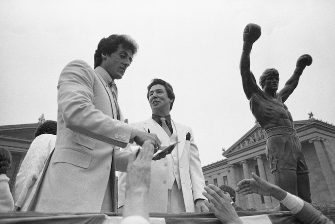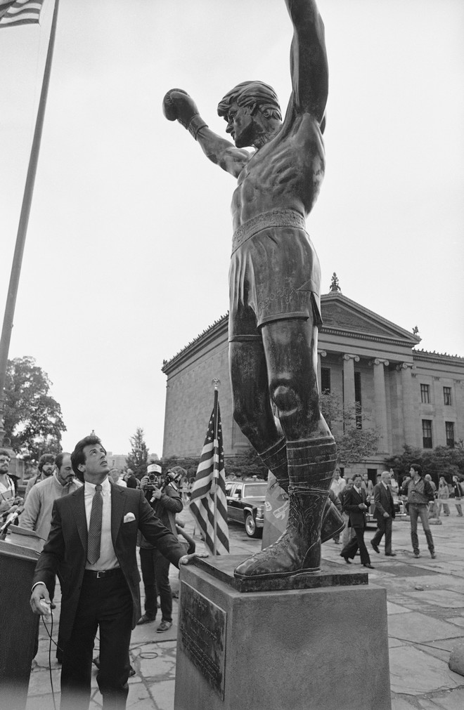 Λίγο πριν ξεκινήσουν τα γυρίσματα για το Rocky III, που κυκλοφόρησε στους κινηματογράφους το 1982, ο Σταλόνε ανέθεσε στον A. Thomas Schomberg να φιλοτεχνήσει για τις ανάγκες της ταινίας ένα χάλκινο άγαλμα του Rocky. Ο γλύπτης από το Κολοράντο δημιούργησε συνολικά τρία αγάλματα βάρους 2 τόνων το καθένα και ύψους τριών μέτρων, τα οποία έπρεπε να μεταφερθούν στα διάσημα σκαλιά της Φιλαδέλφειας.