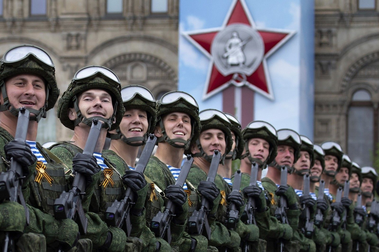 Στην παρέλαση στην Κόκκινη Πλατεία, Ρώσοι στρατιώτες παρελαύνουν βηματίζοντας ρυθμικά υπό τους ήχους τραγουδιών του Β’ Παγκοσμίου Πολέμου, φωνάζουν συνθήματα και παρουσιάζουν στρατιωτικό εξοπλισμό, όπως διηπειρωτικούς πυραύλους και άρματα μάχης, περνώντας μπροστά από το Μαυσωλείο του Λένιν.