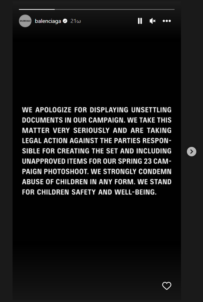 Μετά από την κατακραυγή, η Balenciaga αποφάσισε να αποσύρει την διαφημιστική καμπάνια, ενώ ζήτησε συγγνώμη μέσα από τον επίσημο λογαριασμό της στο Instagram.