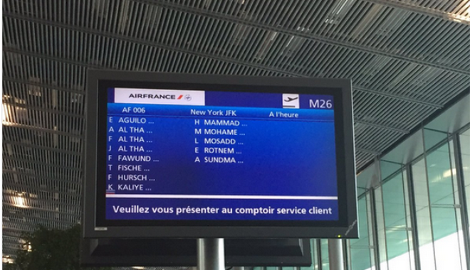 Μια ανακοίνωση σε οθόνη του αεροδρομίου στο Παρίσι της Γαλλίας, προκάλεσε σωρεία αρνητικών σχολίων για τον γαλλικό αερομεταφορέα. Σε αυτή, η Air France παρέθετε μια σειρά από ονόματα επιβατών με προορισμό τη Νέα Υόρκη, που έμοιαζαν να έχουν αραβική καταγωγή και ως εκ τούτου, θα μπορούσαν να αφορούν και σε ανθρώπους με μουσουλμανική πίστη. Άμεσα, αρκετοί υπέθεσαν πως πρόκειται για επιβάτες στους οποίους και απαγορεύεται η είσοδος στις ΗΠΑ.