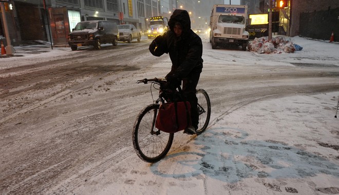 A bicyclist maneuvers through an early morning snowfall, Thursday, Jan. 4, 2018, in New York. Residents across a huge swath of the U.S. awakened Thursday to the beginnings of a massive winter storm expected to deliver snow, ice and high winds followed by possible record-breaking cold as it moves up the Eastern Seaboard from the Carolinas to Maine. (AP Photo/Mark Lennihan) AP Photo/Mark Lennihan