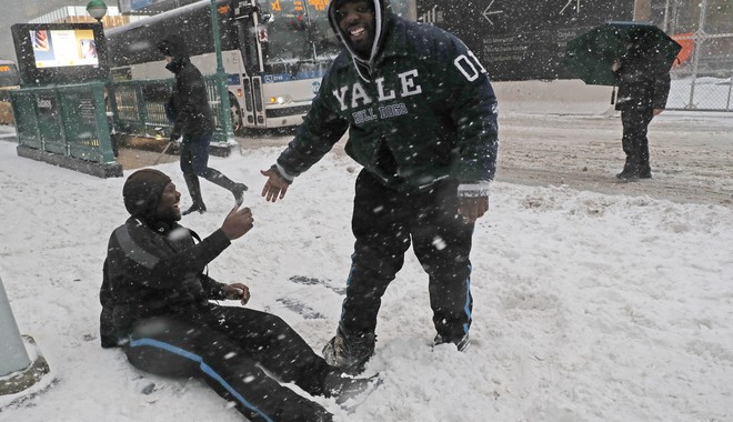 Marcus Greenaway, right, laughs as he helps his friend Psyquan Campbell up after Cambell slipped in the snow crossing a street in lower Manhattan in New York, Thursday, Jan. 4, 2018. A massive winter storm swept from the Carolinas to Maine on Thursday, dumping snow along the coast and bringing strong winds that will usher in possible record-breaking cold.(AP Photo/Kathy Willens) AP Photo/Kathy Willens