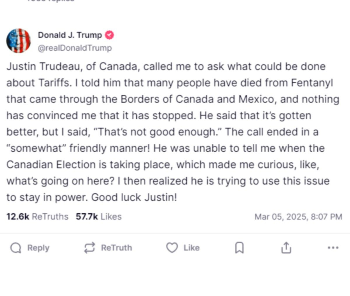 Μετά την επικοινωνία που είχε με τον Καναδό Πρωθυπουργό, Τζάστιν Τριντό, ο Τραμπ σε ανάρτησή του στο Truth Social έκανε λόγο για μία συζήτηση που ολοκληρώθηκε με “κάποια φιλική διάθεση”.